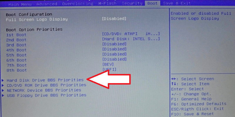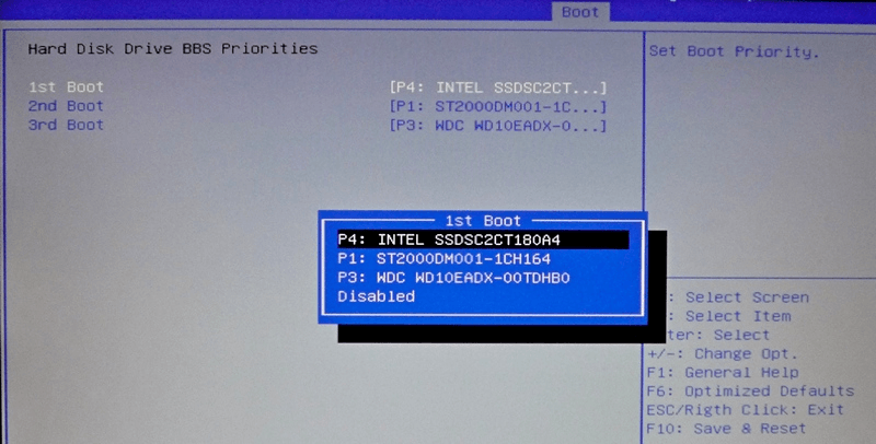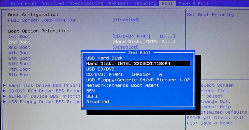 В качестве первого диска для загрузки выбираем диск, на котором установлена операционная система. В нашем случае это Intel SSD. После этого возвращаемся в раздел BOOT и проверяем порядок загрузки операционной системы.