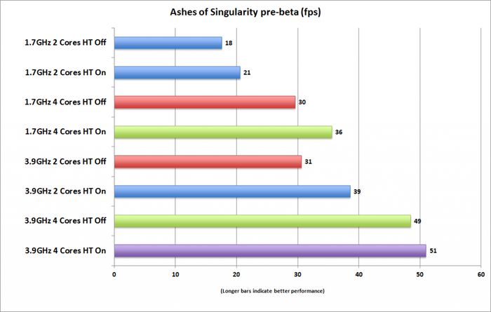 Первоначальные тесты с Ashes of the Singularity демонстрируют и другие интересные вещи. Так, например, они ясно показывают, что количество ядер оказывает более существенное влияние на общую производительность, нежели тактовая частота, на которой они работают. Это, разумеется, не значит, что частота не имеет никакого влияния – просто влияет в меньшей степени.