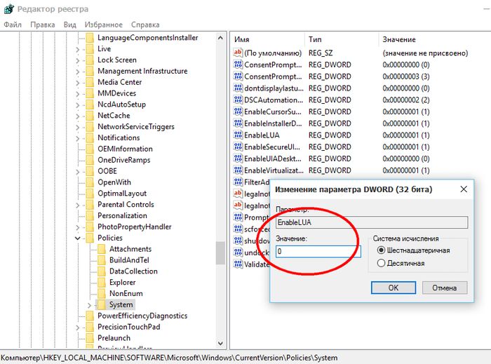 Если это не помогло, временно отключаем UAC любым удобным для вас способом, устанавливаем приложение, а затем вновь включаем контроль учетных записей. Любители копаться в реестре могут воспользоваться следующим твиком. Нужно перейти в раздел HKEY_LOCAL_MACHINE/Software/Microsoft/Windows/CurrentVersion/Policies/System и изменить значение параметра EnableLUA с 1 на 0. Соответственно для включения UAC нужно опять установить 1.