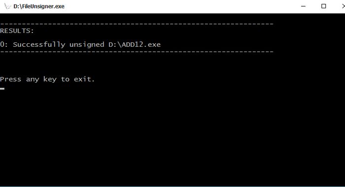 Удаление цифровой подписи является более радикальным вариантом. Здесь вам понадобятся сторонние программные инструменты, например, утилита FileUnsigner. Она бесплатна, не нуждается в установке и очень проста в использовании. Чтобы удалить из файла цифровую подпись, достаточно перетащить его на исполняемый файлы утилиты. При этом вкладка «Цифровая подпись» в свойствах файла должна исчезнуть.