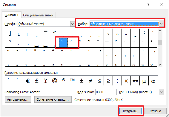 После этого перед вами появится окно со списком доступных символов. Для того чтобы поставить ударение здесь нужно выбрать набор символов «Объединенные диакр. знаки» и выделить один из символов ударения, с наклоном вправо или в лево. После выбора нужного ударения нужно нажать на кнопку «Вставить». В результате, над буковой, после которой был установлен курсор, появится ударение.