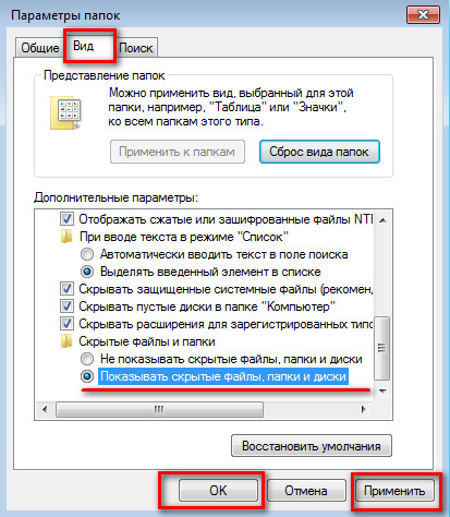 - откройте вкладку «Вид» и в группе «Дополнительные параметры» в разделе «Скрытые файлы папки» включите радиокнопку напротив настройки «Показывать скрытые…»;