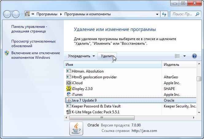 На экране появится окно «Программы и компоненты». В списке установленных программ найдите Java и нажмите на кнопку «Удалить».