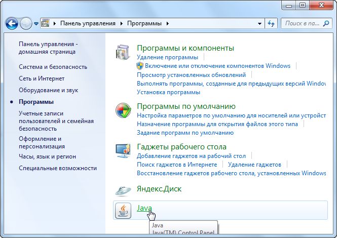Чтобы отключить Java, откройте «Панель управления», перейдите в раздел «Программы» и откройте апплет Java.