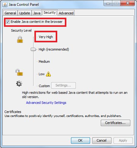 Откроется панель управления Java. Во вкладке Security вы можете активировать самый высокий уровень безопасности или отключить Java полностью – для этого снимите флажок с опции Enable Java content in the browser и нажмите на кнопку Apply/OK.