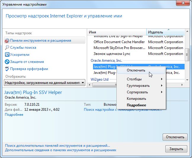 Чтобы отключить плагин Java в Internet Explorer, можно воспользоваться менеджером надстроек. Через него необходимо отключить Java(tm) Plug-in 2 SSV Helper и Sun Microsystems Deployment Toolkit. Но этого на самом деле недостаточно. Еще нужно изменить некоторые параметры реестра, чтобы полностью отключить Java в IE.