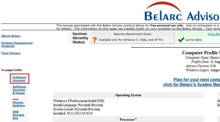 Belarc Advisor 8.3b – программа, которая распространяется совершенно бесплатно. Она покажет вам не только лицензионный ключ вашей копии Windows, но и подробную информацию об установленном программном обеспечении, аппаратных компонентах и т.д., поэтому при запуске программа проводит тщательный анализ всей системы.
