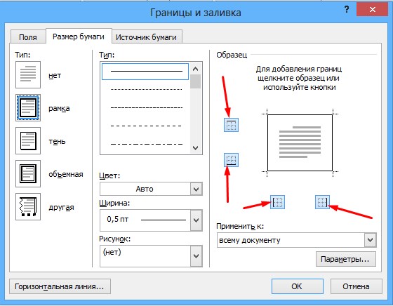 После чего откроется диалоговое окно с названием «Границы и заливка». В нем сразу же обращаем внимание на левую часть она, которое называется «Поле». Убедитесь, что в границы страницы обрамлены (смотрите скриншот ниже).