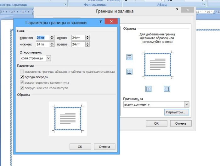 Помочь разобрать вам поможет образец, который также расположен в данном диалоговом окне. То есть при помощи раздела «Поля» вы можете установить отступы текста от вами созданной рамки. Ничего сложно в этом нет, пару раз потренируетесь и можете найти необходимое для вас соотношение сторон.