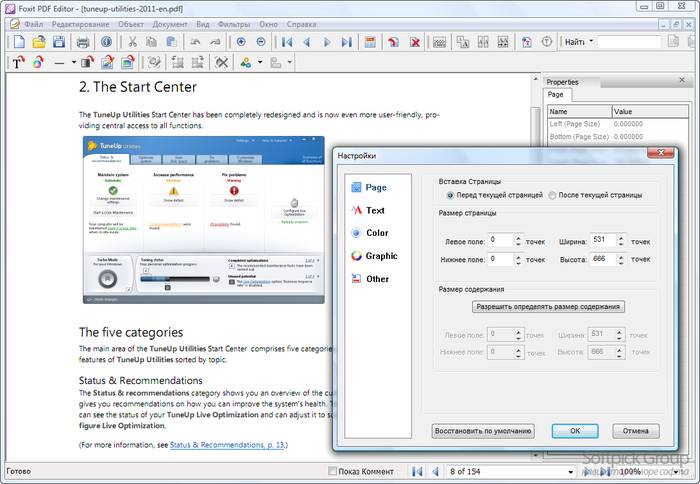 - размер страницы легко меняется, можно изменять и отступы, вращать страницу;