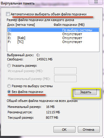 1. В панели «Виртуальная память» отключите опцию «Автоматически выбирать объём… ».