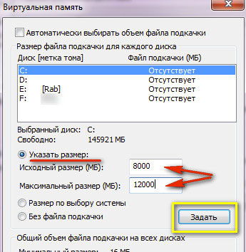 - Максимальный размер — установите размер в 2 раза больший RAM. (Но допускаются и меньшие значения, превышающие параметр «Исходный размер»).