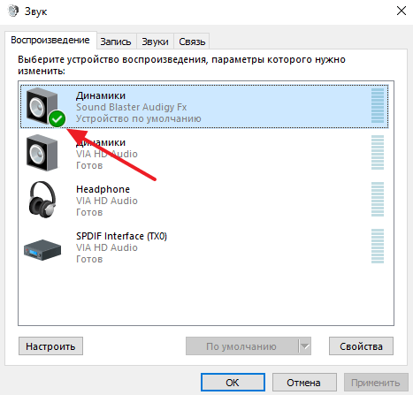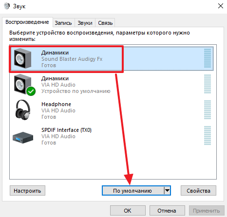 Если на вашем компьютере две звуковых карты (например, встроенная и дискретная), то у вас может не работать звук из-за того, что в настройках Windows активной выбрана не та звуковая карта, к которой подключены колонки. Чтобы исправить эту проблему выделите мышкой нужные колонки и нажмите на кнопку «По умолчанию».