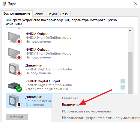 Для того чтобы включить колонки кликните по ним правой кнопкой мышки и выберите вариант «Включить».