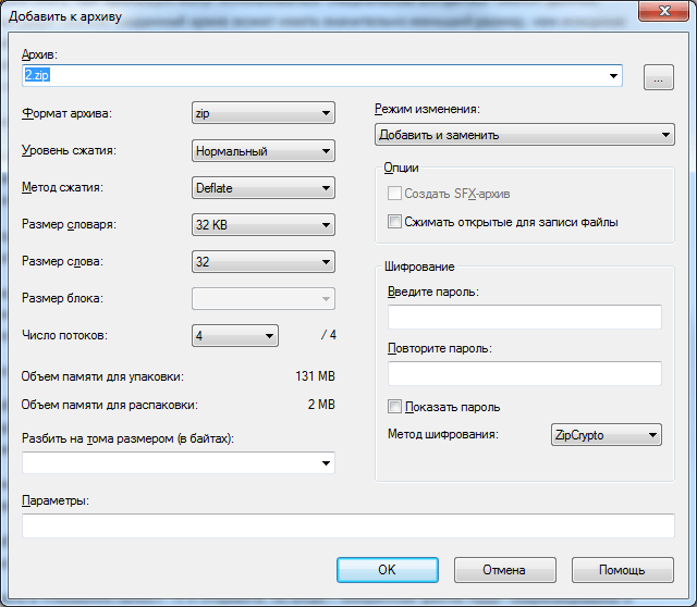 Добавить к архиву – добавить выбранные файлы в архив с возможностью настроить вручную все параметры архивирования. После запуска откроется окно, в котором можно будет выбрать формат архива, пароль на архив, степень сжатия и другие параметры.