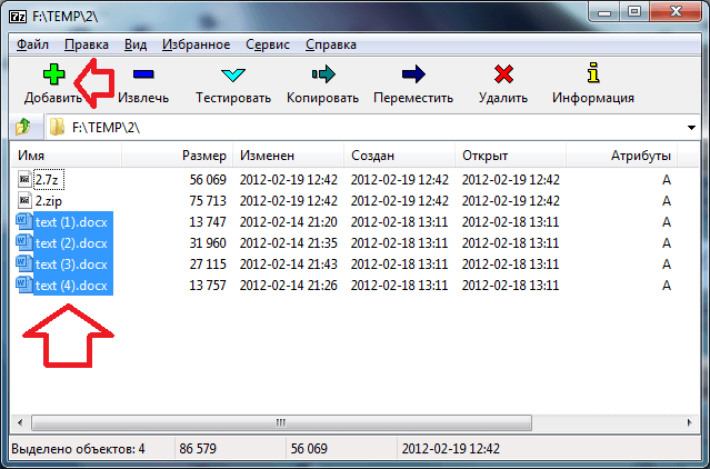Также создать архив можно из интерфейса программы 7zip. Для этого запустите 7zip File Manager, выделите необходимые файлы и нажмите на кнопку «Добавить». После этого откроется окно с параметрами архивирования.