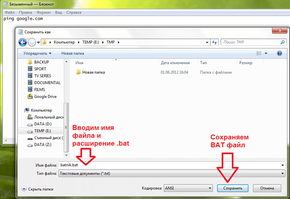 Создать BAT файл очень просто. Для этого достаточно запустить любой простой текстовый редактор, например «Блокнот», ввести команды и сохранить с расширением BAT.