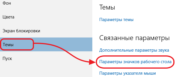 После того как вы открыли окно «Персонализация», вам нужно перейти в раздел «Темы» (ссылка на него будет в боковом меню), а потом открыть подраздел «Параметры значков рабочего стола».