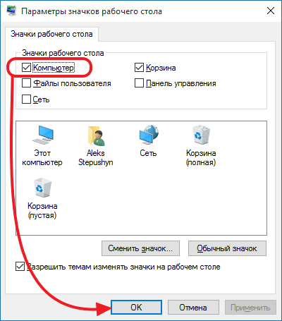 После выполнения этой команды вам останется только установить отметку напротив пункта «Компьютер» и сохранить настройки нажатием на кнопку«ОК».