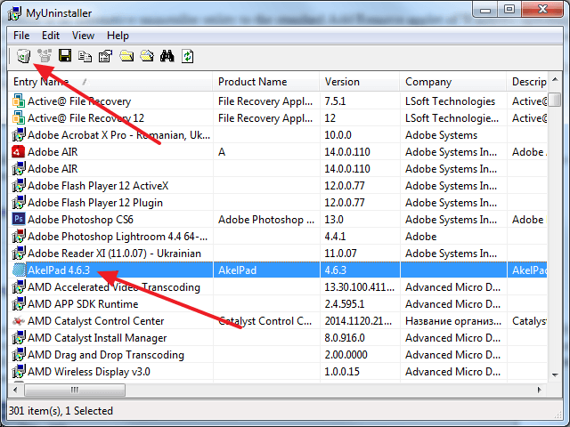 После этого в окне программы появится список всех установленных на вашем компьютере программ. Здесь нужно выделить ненужную программу, которую вы хотите удалить, и нажать на кнопку с изображением корзины.