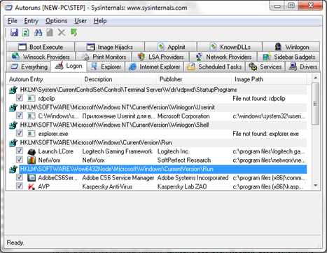 Данная программа предоставляет пользователю полный доступ ко всем способам автозагрузки в системе. Но нас, в первую очередь, интересуют вкладки под названиями «Logon» (здесь хранятся записи о программах, записанных в автозагрузку) и «Services» (программы, записанные в автозагрузку как службы).