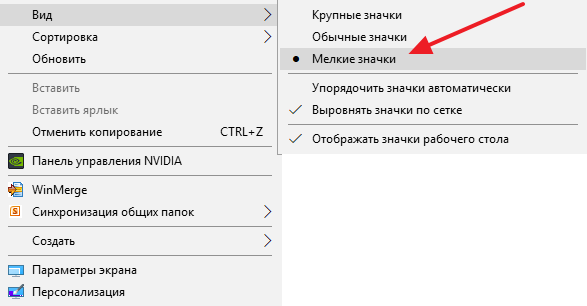 Решается это очень просто. Нужно кликнуть правой кнопкой мышки по рабочему столу, перейти в меню «Вид» и выбрать «Мелкие значки».