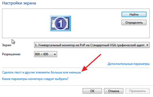 Дальше нужно кликнуть по ссылке «Сделать текст и другие элементы больше или меньше».