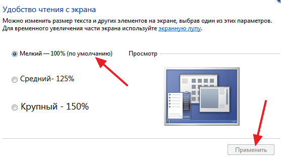 В результате откроется окно с настройками масштаба текста. Здесь нужно выбрать вариант «Мелкий – 100%» и сохранить изменения кнопкой «Применить».