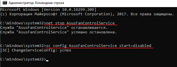 Для примера остановим службу «AsusFanControlService» и изменим способ ее запуска на «Отключено». Для этого поочередно выполним команды «net stop AsusFanControlService» и «sc config AsusFanControlService start=disabled».