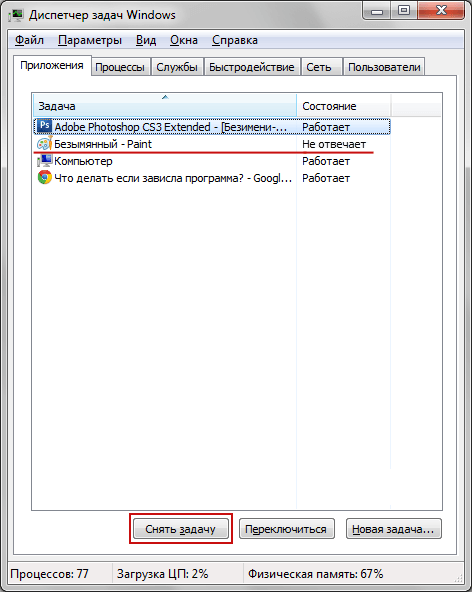 Шаг № 2. Попробуйте запустить диспетчер задач (комбинация клавиш Ctrl-Del). В Диспетчере задач, на вкладке «Приложения» будут отображены все запущенные программы. Напротив зависших программ будет надпись «Не отвечает». Такие программы можно завершить с помощью команды «Снять задачу»