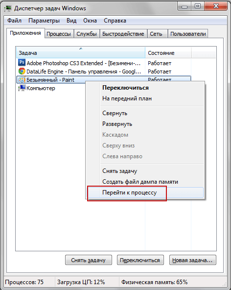 Если закрыть программу таким способом не удастся, то перейдите на вкладку «Процессы». Это можно сделать кликнув правой кнопкой мышки по программе и выбрав пункт «Перейти к процессу».