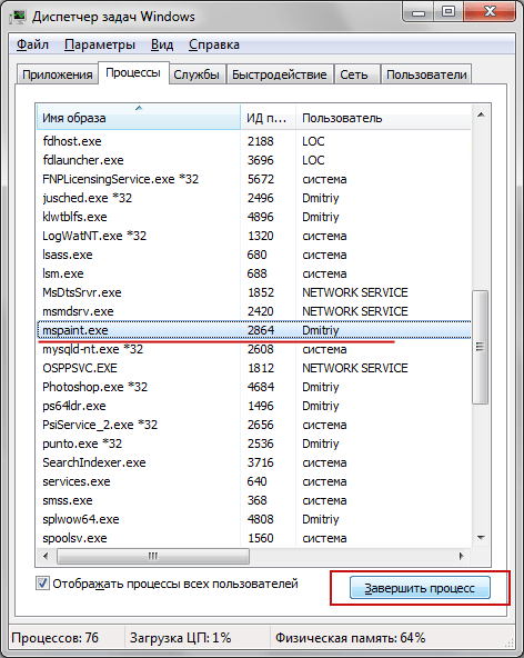 После этого вы сможете закрыть программу с помощью команды «Завершить процесс».