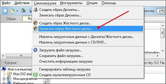 Программа UltraISO это платная программа для работы с образами дисков. Кроме всего прочего данная программа умеет создавать загрузочные флешки. Для того чтобы создать загрузочную флешку с помощью программы UltraISO нужно открыть ISO образ в программе, открыть меню «Самозагрузка» и выбрать пункт «Записать образ Жесткого диска».