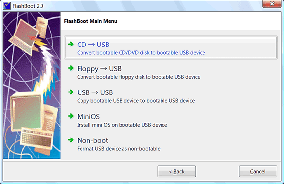 FlashBoot платная программа для создания загрузочных флешек. С помощью данной программы можно отформатировать флешку и перенести на нее установочные файлы операционной системы. Программа FlashBoot во много похожа на Windows 7 USB/DVD Download tool, но имеет больше функций. Например, с помощью FlashBoot можно перенести создать загрузочную флешку непосредственно с оптического диска, того как Windows 7 USB/DVD Download tool требует образ диска в формате ISO.