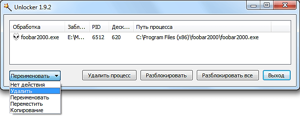- Удалить процесс – программа Unlocker завершит работу программы, которая блокирует удаление файла.