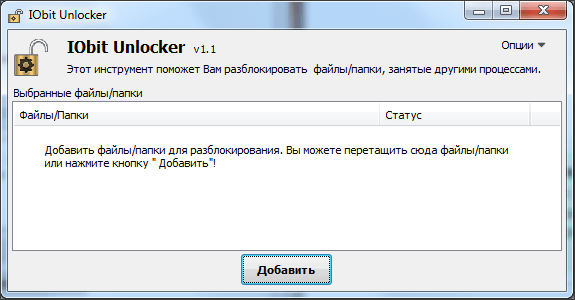 Программу IObit Unlocker можно использовать как из контекстного меню, так и просто запустив программу. После запуска программы вы увидите окно, в которое нужно перетащить файлы, которые вы не можете удалить.