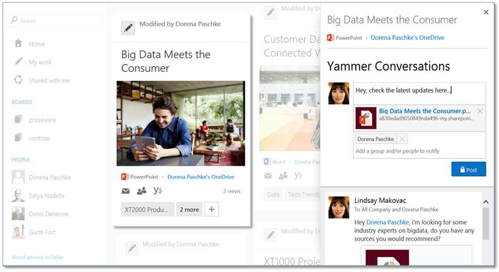 Сегодня Microsoft сделала еще один шаг вперед в своей стратегии, ориентированной на профессиональную среду, запустив Office Delve для корпоративных клиентов в рамках ежегодной конференции Convergence 2015, которая сосредоточена именно на этой категории пользователей. Во время своего выступления генеральный директор Microsoft Сатья Наделла показал преимущества нового инструмента.