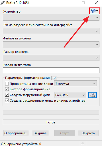 При необходимости, после запуска можно изменить язык интерфейса. Rufus поддерживает большое количество языков, среди которых есть: русский, украинский и английский. Кнопка для смены языка находится в правом верхнем углу программы.