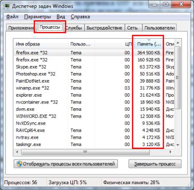 - Не включать одновременно все программы. Зайдите в тот же диспетчер задач, выберите вкладку «Процессы» и посмотрите, сколько памяти кушает браузер, Skype и прочие процессы, тормозящие компьютер. Если определенные программы вам не нужны – выключите их.