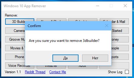 Для того чтобы раз и навсегда распрощаться с любым из упомянутых выше приложений, скачайте программу (ссылка в конце статьи) и запустите исполняемый файл. Затем в интерфейсе Windows 10 App Remover нажмите на название приложения, которое хотите удалить, и подтвердите удаление, нажав «Да». Не запускайте инструмент с правами администратора, иначе он не будет работать.