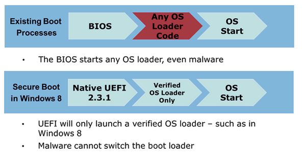Как и Windows 8, десятая версия Windows будет поддерживать параметр UEFI Secure Boot. Напомню, что это мера безопасности, которая защищает компьютер от различных вредоносных программ, которые загружаются до операционной системы, и это крайне затрудняет их удаление. Secure Boot решает эту проблему, подвергая проверке каждую программу, которой требуется загрузка до операционной системы – в том числе так называемый модуль bootloader, который управляет процессом запуска любой ОС.