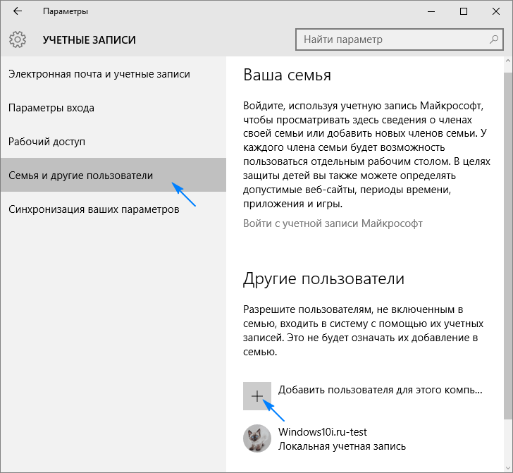 Первый раздел «Ваша семья» при наличии аккаунта Майкрософт позволит создать учетные записи с ограниченными правами для иных членов семьи, например, для детей.