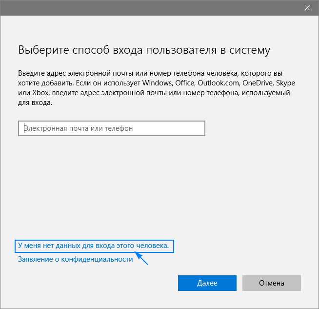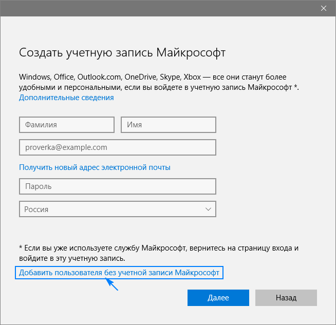 6. Если хотите создать ее, заполняете все формы и жмете «Далее», в ином случае переходите по ссылке «Добавить пользователя без учетной записи Майкрософт», которая размещена внизу окна.