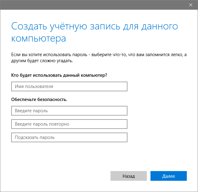 7. Далее задаем имя нового пользователя, вводим надежный пароль, необходимый для авторизации, и подсказку для случаев, если его забыли.