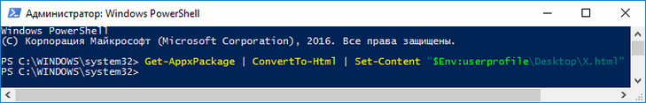 Get-AppxPackage | ConvertTo-Html | Set-Content «$Env:userprofileDesktopX.html»