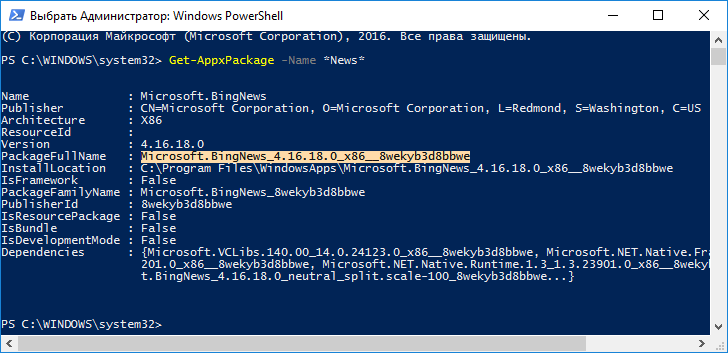 Выделяем значение 6 строчки «PackageFullName» и копируем его в буфер через контекстное меню или посредством комбинации Ctrl+C.