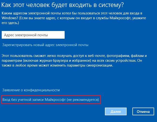 Далее нажмите «Добавить пользователя без учетной записи Майкрософт».