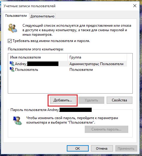 В окне «Учетные записи пользователей» нажмите «Добавить».