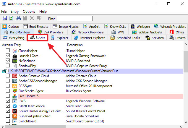 Для очистки автозагрузки перейдите на вкладку «Logon». Изучите программы, которые находятся на этой вкладке. После чего снимите галочки напротив тех программ, которые можно убрать из автозагрузки.