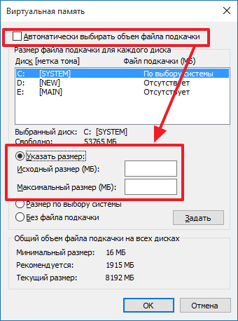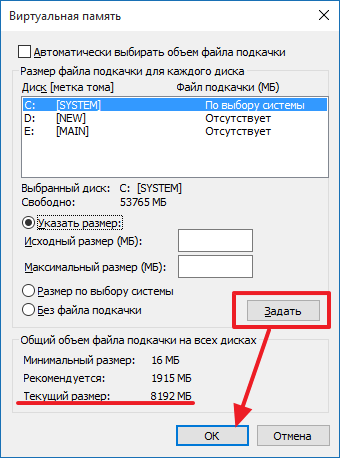 Посмотрите текущий размер файла подкачки внизу окна и укажите больший размер в соответствующих полях.